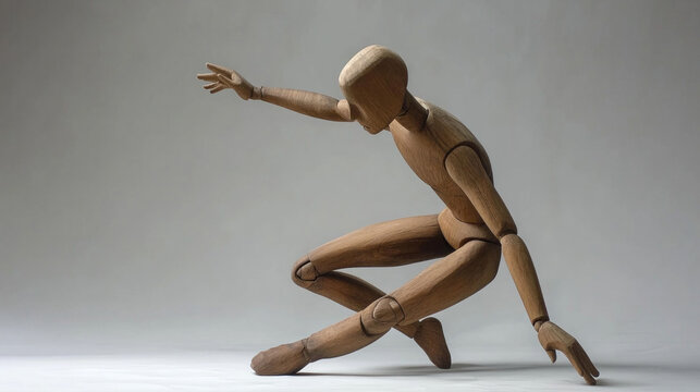 Dynamic wooden mannequin in an expressive pose showcasing movement and balance