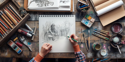 Point-of-view of a person drawing on a sketchpad, with pencils and art supplies spread out on a wooden table, and the sketchpad showing a partially completed drawing.