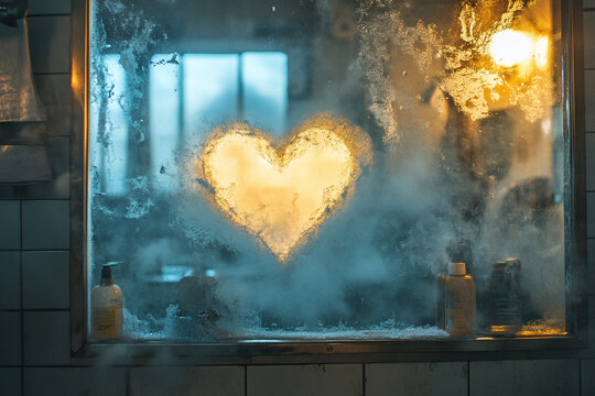 a heart drawn on a steamy bathroom mirror.