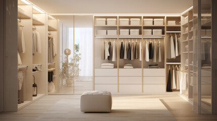 Modern luxury stylish white walk in closet feminine dressing room, minimal walk in wardrobe interior design