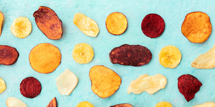 A panoramic overhead shot of dry fruit and vegetable chips. Healthy vegan snack, an organic food flat lay pattern on a teal blue background
