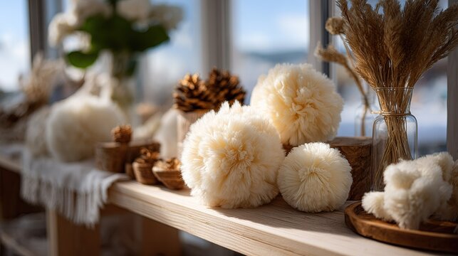 Soft fluffy cream colored pom poms and dried grasses are arranged on  wooden shelf by  window with pine cones and white flowers in  background