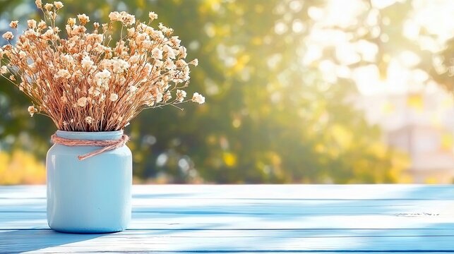 A bouquet of dried white flowers in a light blue jar is placed on a blue wooden table, with a soft, sunlit green background.