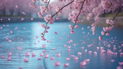 small wooden boat drifting beneath cherry blossom trees, their petals floating gently on the water