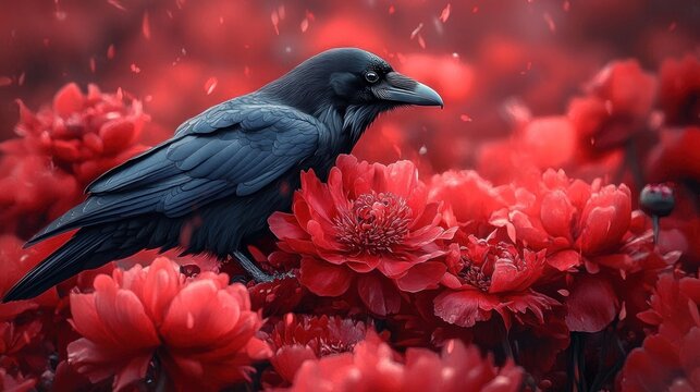 black raven perched among lush red peonies with drifting petals, moody and mysterious floral scene evoking melancholy and quiet beauty