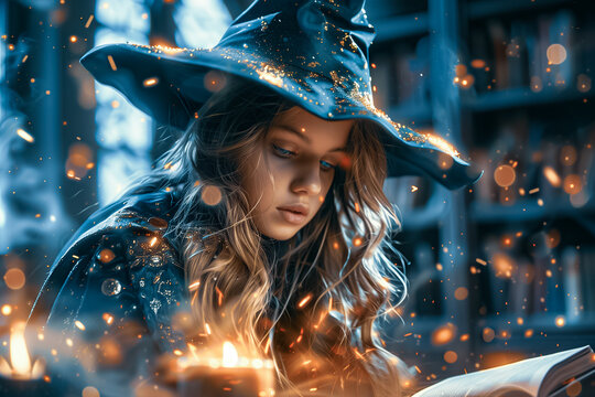 A young witch with long, flowing hair and a pointed hat intently studies an ancient book in a dimly lit library, surrounded by drifting magical sparks and ethereal light