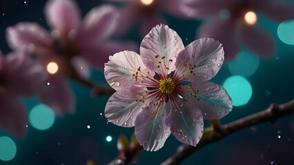 A close-up view of a glowing cherry blossom, its petals shimmering in turquoise and lavender, with glowing sparks of light drifting gently in the air around it.