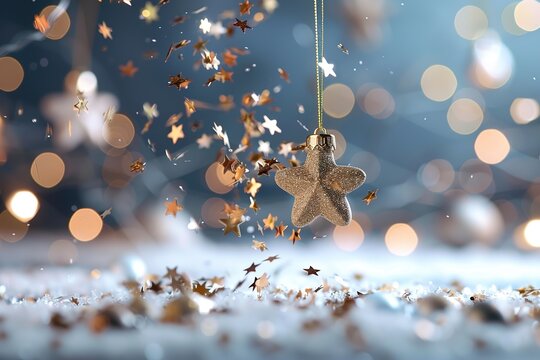 Elegant glass and gold baubles with drifting star confetti