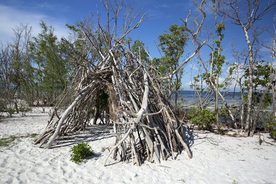 Tent like shelter of drift wood on empty beach, hide away, cast away stranded on island, traveling off the beaten track