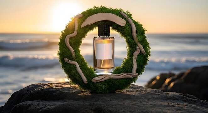 Perfume bottle on a moss wreath with driftwood on a rock at the beach at sunset