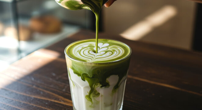 Pouring Green Matcha Tea Latte Art into Glass of Milk