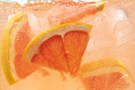Close up view of the lemon and grapefruit slices in lemonade background. Texture of cooling sweet summer's drink with macro bubbles on the glass wall. Fizzing or floating up to top of surface.
