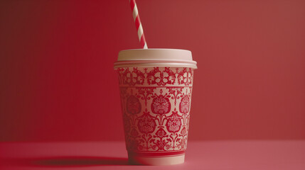 Against a red background, an ornate patterned paper take-out cup with a lid and a straw protruding from it.