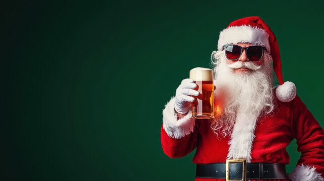 Trendy Santa Claus in sunglasses drinking beer. Sales banner, deep red and green colors, copy space. Generative AI
