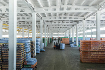 panoramic view of a large warehouse with drinks in plastic bottles with loading machines