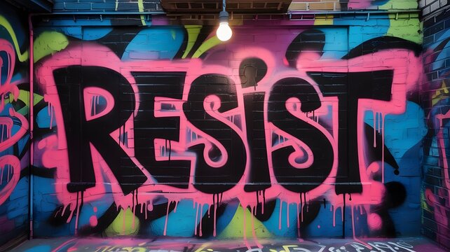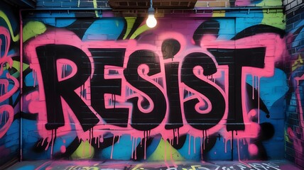 Black graffiti letters R E S I S T with pink spray paint drips on brick wall resist street art