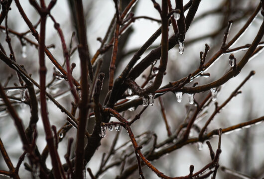 Blue icicles hanging from a tree branch isolated on white background, a frozen winter nature detail, cold weather ice crystals close-up.