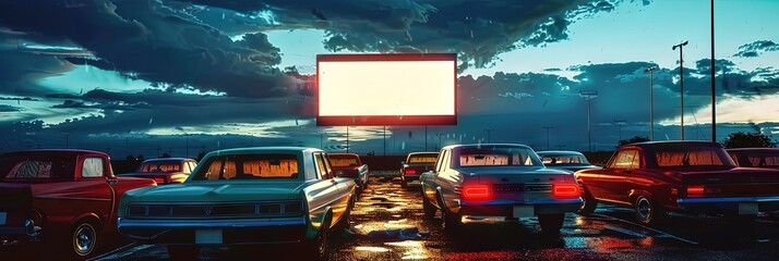 Retro cars in front of a large screen with a movie. Classic drive-in theatre wallpaper