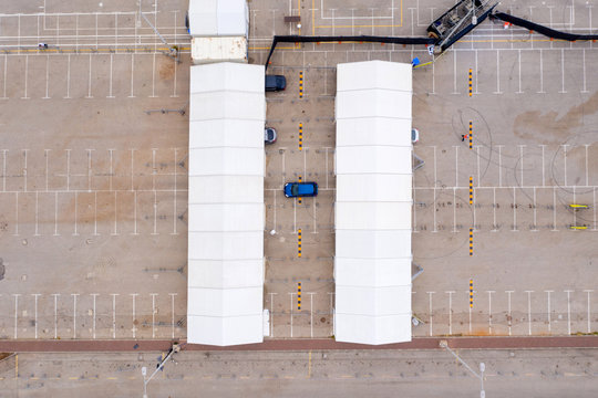 Cars line up at the Covid-19 testing site for drive-thru testing. People await to receive nasal swab tests for COVID-19.