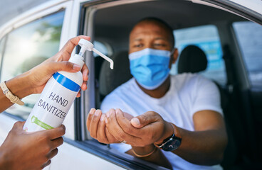 Covid, cleaning and hygiene at drive thru testing centre or station for coronavirus. African man driving his car and wearing protective face mask to avoid contact with medical worker