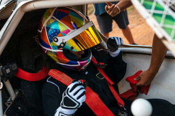 Close up of female race car driver wearing helmet and gloves, looking confident and focused, preparing for race or driving session, with blurred background of racing track or garage