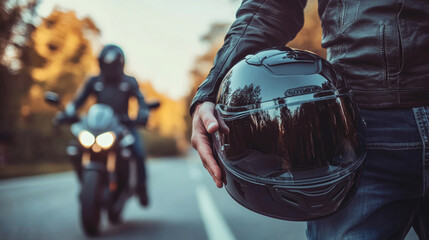 A man is holding a black motorcycle helmet while riding a motorcycle. The helmet is shiny and black, and it is an important piece of safety gear for the rider