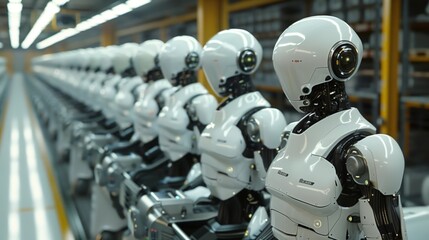 Row of Futuristic Robots on a Production Line in a Modern Factory Setting