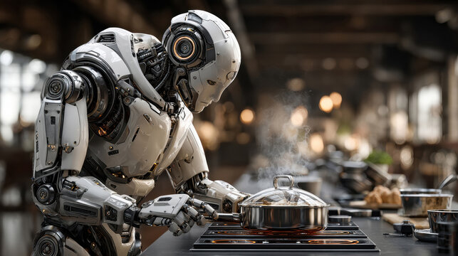 Advanced humanoid robot cooking in modern kitchen with futuristic technology and artificial intelligence