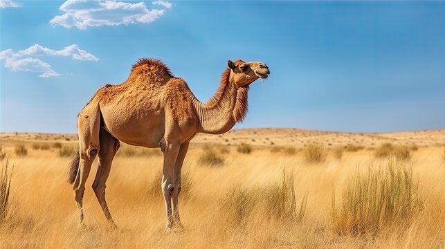 Dromedary or Arabian camel, Camelus dromedarius, even-toed ungulate with one hump on back. Camel in the long golden grass in Shaumary Reserve, Jordan, Arabia. Summer day in wild nature.