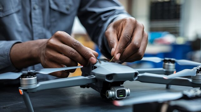 Close-up on a black person repairing a drone: Hands working on aerial equipment with tools against a backdrop of technology and wireless components.