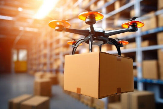Drone delivering groceries over city rooftop carrying crate of fresh produce and beverages