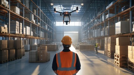 Warehouse manager using an automated drone for delivering packages inside a storage facility, optimizing logistics and streamlining operations in a modern industrial setting