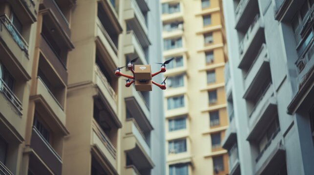 Urban Drone Delivery: Drone Hovering Above Rooftop to Deliver Package to High-Rise Apartment, Showcasing Innovative Technology for Elevated Urban Deliveries