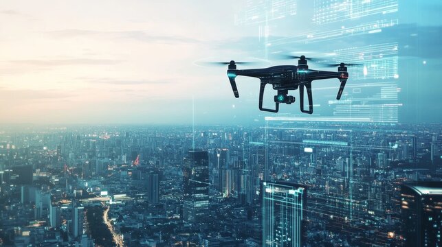 Foldable quadcopter drone hovering skilfully in minimalistic setting, streamline design