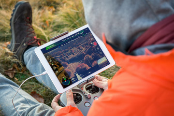 Man Operating drone remote controller.