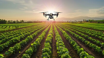 Drone Flies over a lush green field of crops at sunset. The sun is setting in the distance, casting a warm glow over the landscape.