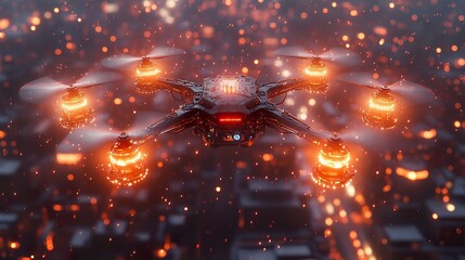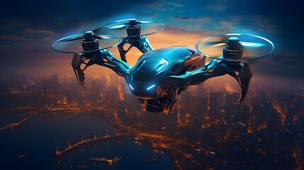 Futuristic drone hovering over city rooftop at dusk