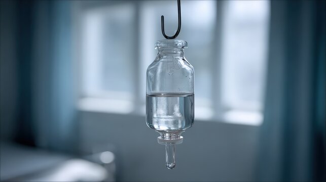 Intravenous infusion bottle with clear liquid in hospital setting