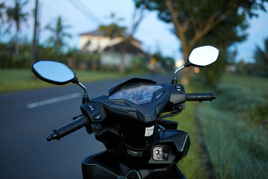 The foggy mirror and the speedometer on the scooter are covered with morning dew.