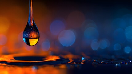 Dramatic close-up of a water droplet suspended above a reflective surface with vibrant colors.