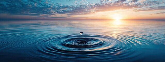 Water droplet impact creating concentric ripples on a dark teal surface.