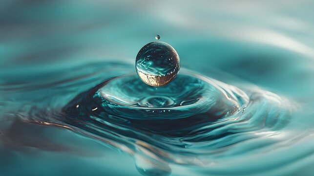 Perfect water droplet with ripple on calm surface creating sense of tranquility