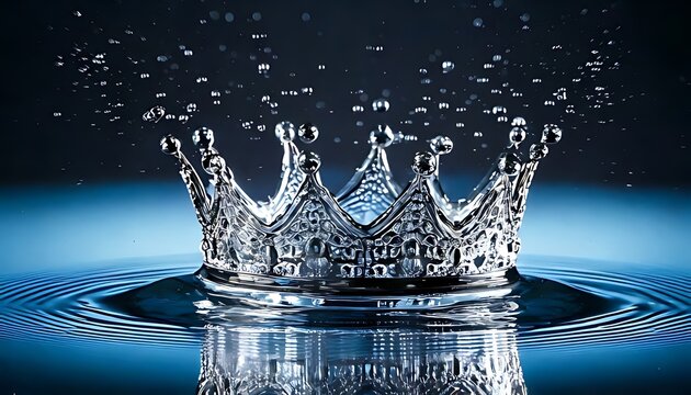 A majestic crown meticulously crafted from shimmering water, splashing upwards. The reflection glistens on the ripples