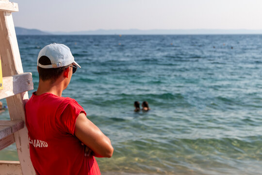 Lifeguard on Lagomandra beach to ensure safety on the beach. Bathing season in Greece.Summer vacation