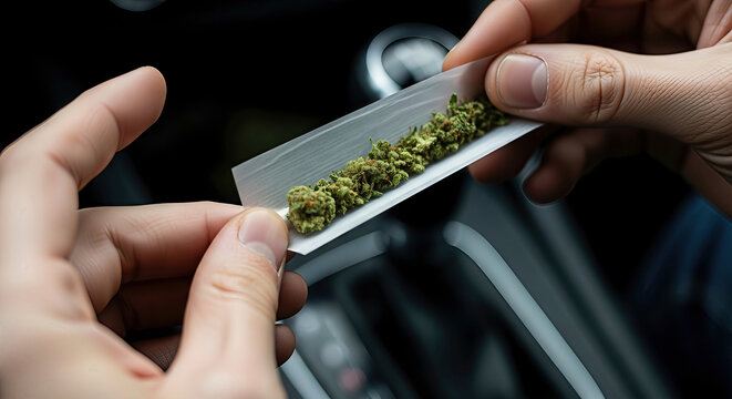 Close-up of man's hands rolling marijuana joint in a car. An illegal activity with recreational drug. Addiction treatment, alternative medicine, cannabis culture.