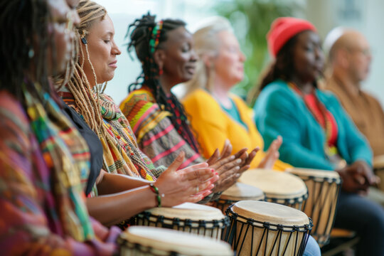 a multicultural drumming circle with participants playing various drums