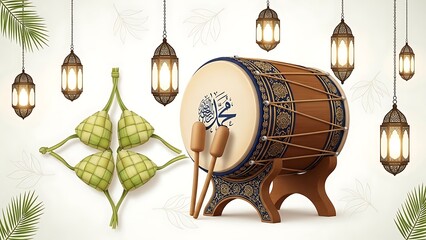 Ramadan drum with lanterns for festive celebration of muslim holy month, copy space.