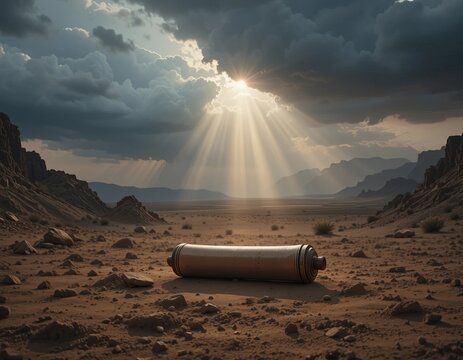 Corroded battery standing in soil with dry tree branches, symbolizing pollution, toxic waste, and environmental damage