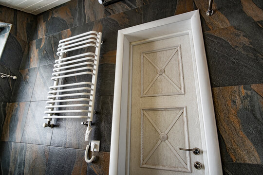 White contemporary electric towel dryer mounted on black tiled wall in modern bathroom.