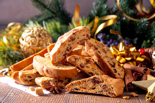 many pastries and almond biscuits with icing and candied fruit